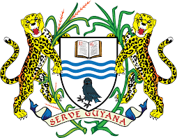 En el escudo de armas de Guyana figuran, en un campo de plata, tres ondas de azur que representan a los ríos y mares del país. Las tres ondas están surmontadas por la figura de la Victoria amazónica situada en el jefe. En la punta un hoatzín(Opisthocomus hoazin) en colores naturales, otro de los símbolos nacionales.